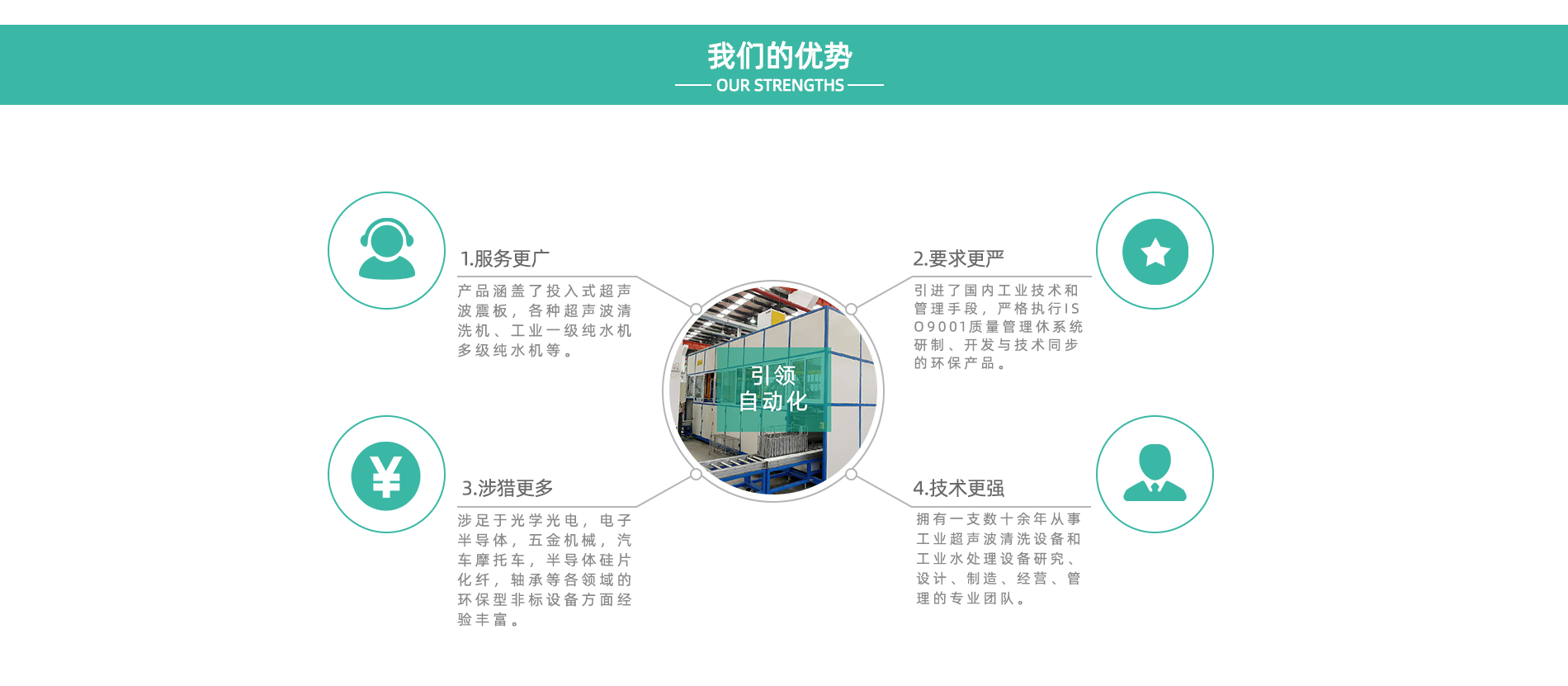 天津市引領(lǐng)自動(dòng)化科技有限公司是由一支擁有數(shù)十余年工業(yè)超聲波清洗設(shè)備和工業(yè)水處理設(shè)備研究、設(shè)計(jì)、制造、經(jīng)營(yíng)、管理、銷售、服務(wù)于一體的企業(yè)。 公司匯集了一批長(zhǎng)期致力于工業(yè)清洗設(shè)備和工業(yè)水處理設(shè)備研發(fā)、設(shè)計(jì)、制造的人才,引進(jìn)了國(guó)內(nèi)外的工藝技術(shù)和管理手段,嚴(yán)格執(zhí)行ISO9001質(zhì)量管理體系,研制、開(kāi)發(fā)與技術(shù)同步的環(huán)保產(chǎn)品。選用日本、美國(guó)等原材料、元器件,以設(shè)備、熱忱的服務(wù)、合理的價(jià)格為廣大用戶提供質(zhì)量穩(wěn)定、外形美觀的十多個(gè)系列、百余個(gè)規(guī)格的超聲波清洗設(shè)備、高壓噴淋清洗設(shè)備、工業(yè)水處理設(shè)備。產(chǎn)品涵蓋了投入式超聲波震板,單槽式超聲波清洗機(jī)、多槽式超聲波清洗機(jī)、氣相型清洗機(jī)、自動(dòng)型超聲波清洗機(jī)、碳?xì)漕惓暡ㄇ逑礄C(jī),高低壓噴淋清洗機(jī)等以及工業(yè)冷水機(jī),工業(yè)一級(jí)純水機(jī)多級(jí)純水機(jī)等。 產(chǎn)品具備完善的售前,售中,售后服務(wù)制度。尤其在開(kāi)發(fā)設(shè)計(jì)光學(xué)光電,電子半導(dǎo)體,五金機(jī)械,汽車摩托車,電池,半導(dǎo)體硅片,化纖,軸承等各領(lǐng)...